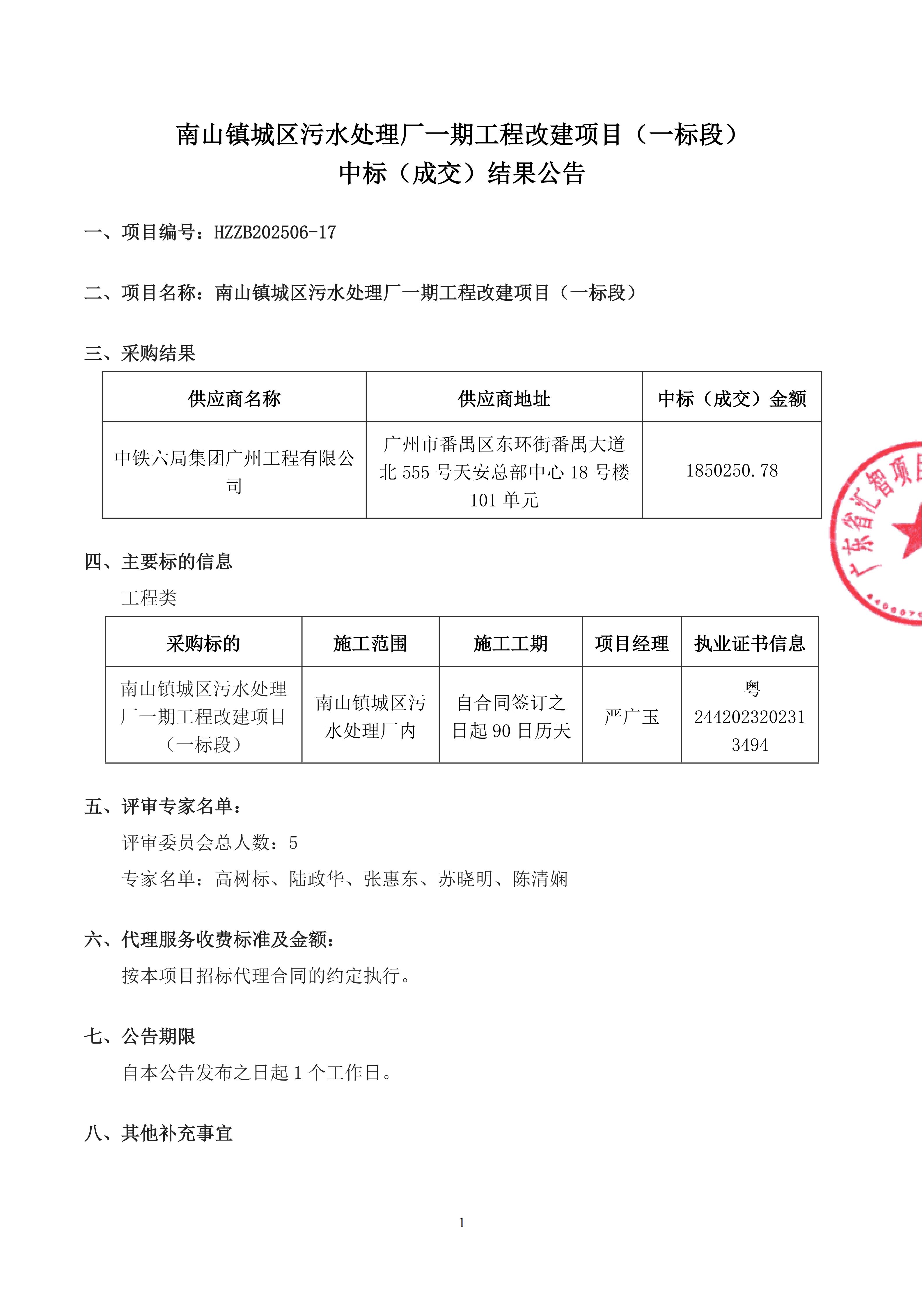 南山镇城区污水处理厂一期工程改建项目(一标段)中标(成交)结果公告
