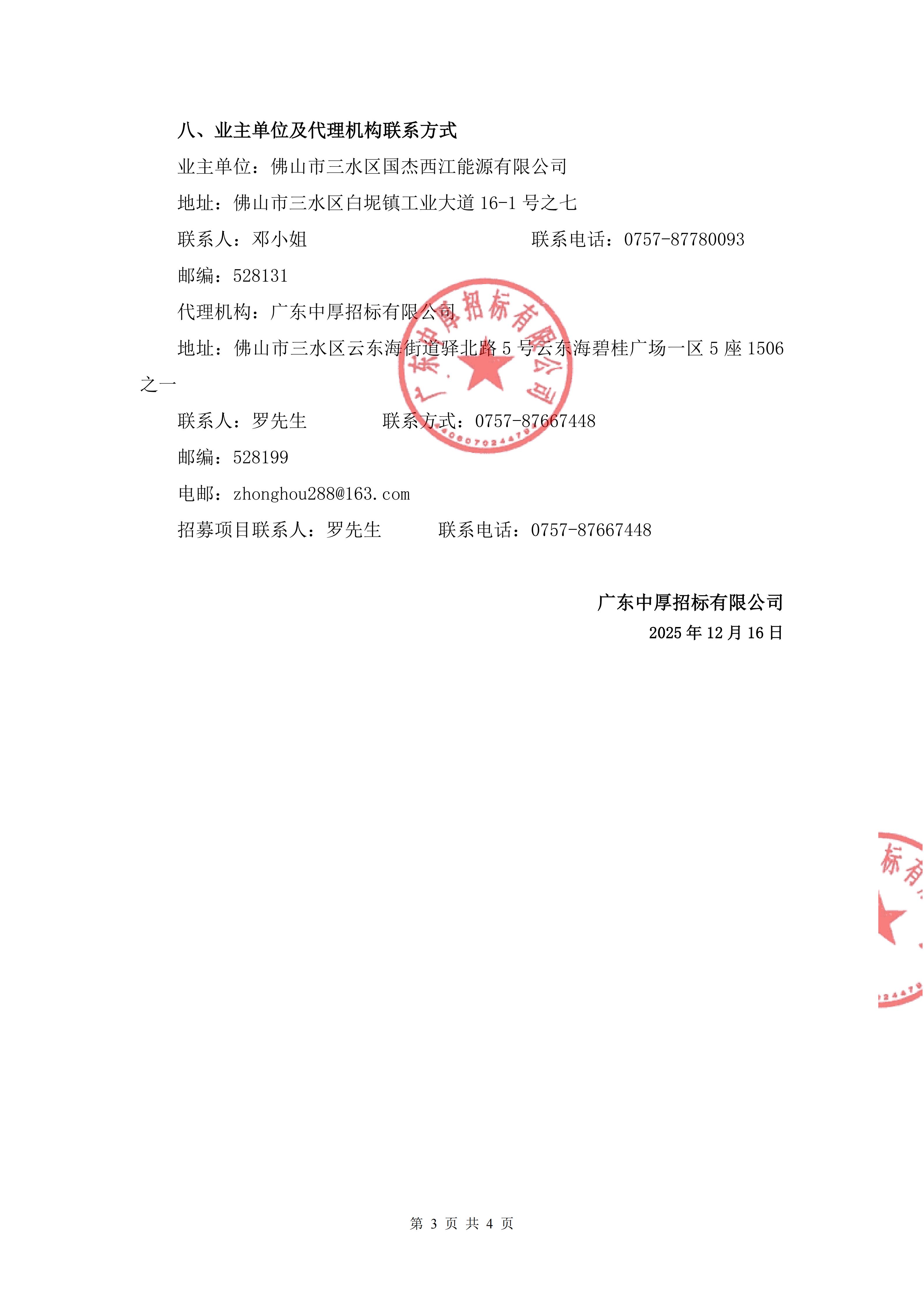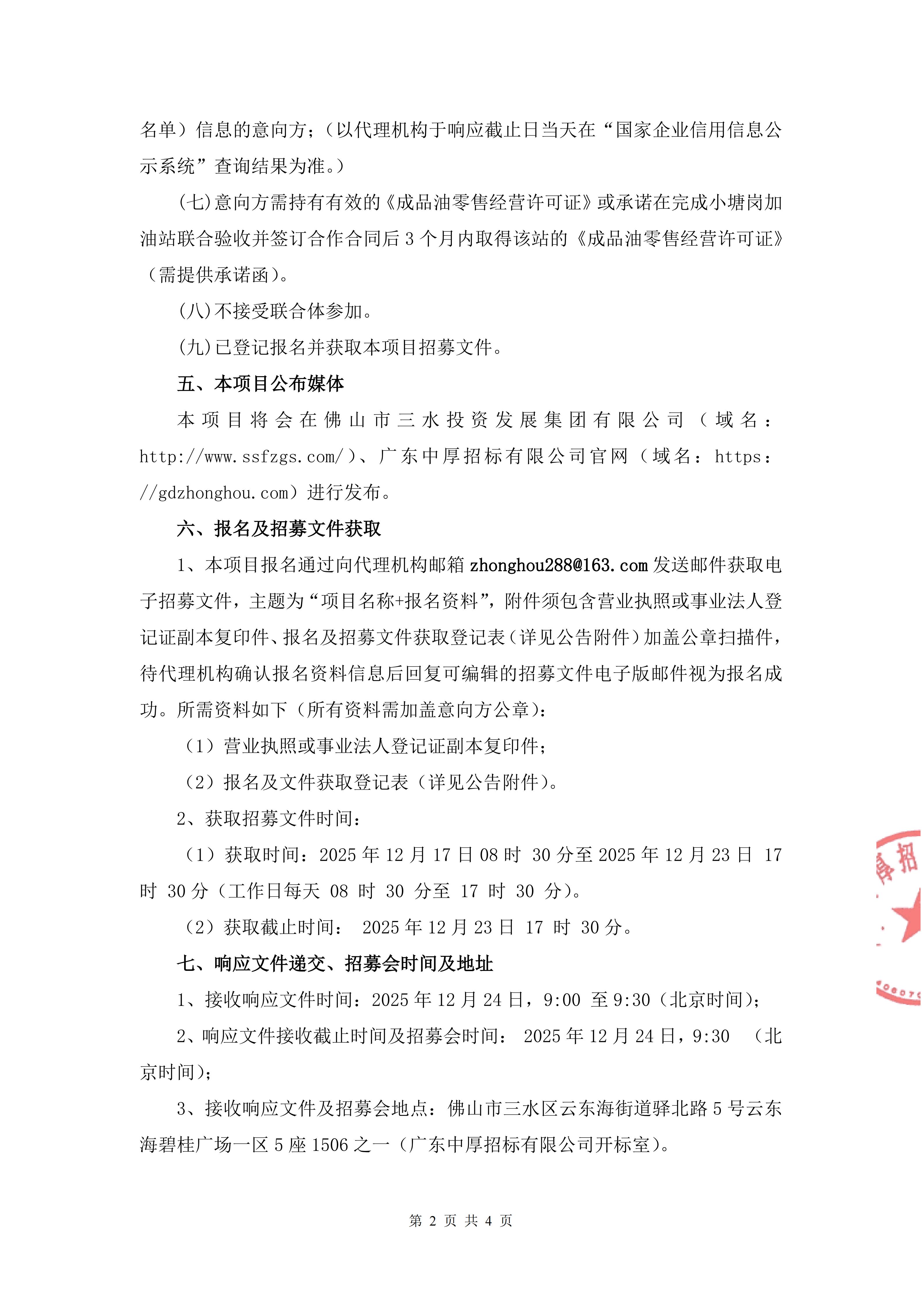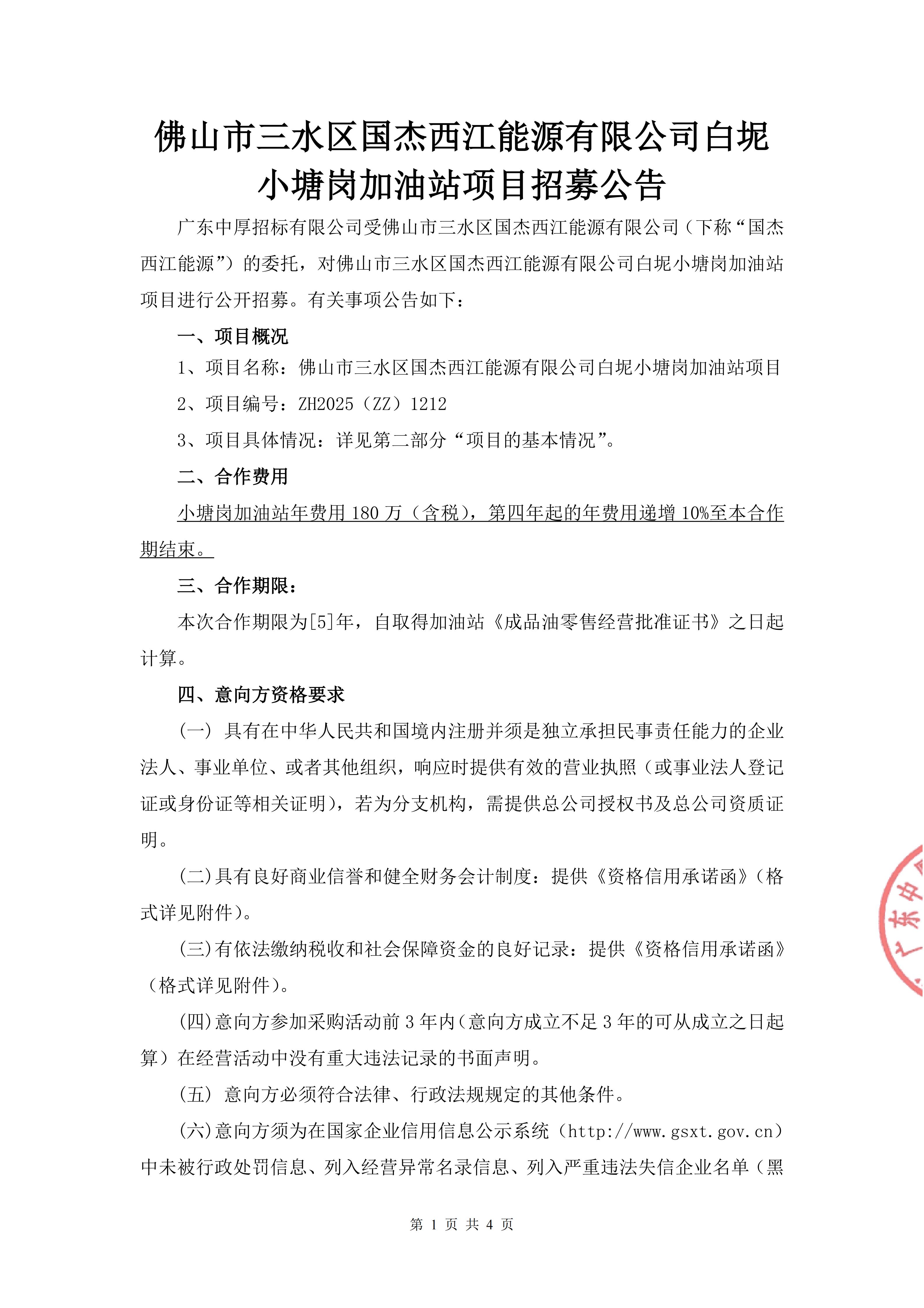 佛山市三水区国杰西江能源有限公司白坭小塘岗加油站项目招募公告