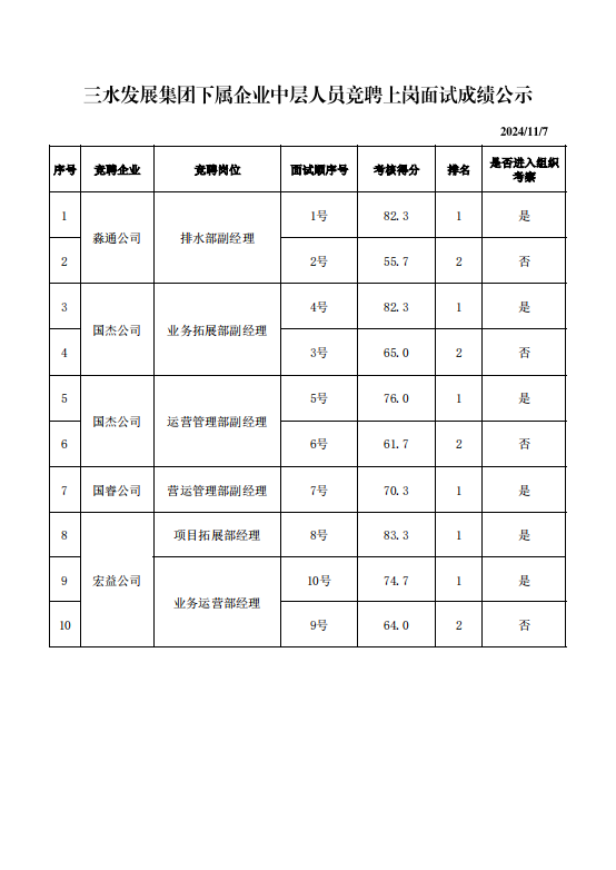 bwin必赢唯一官方网站集团下属企业中层人员竞聘上岗面试成绩公示